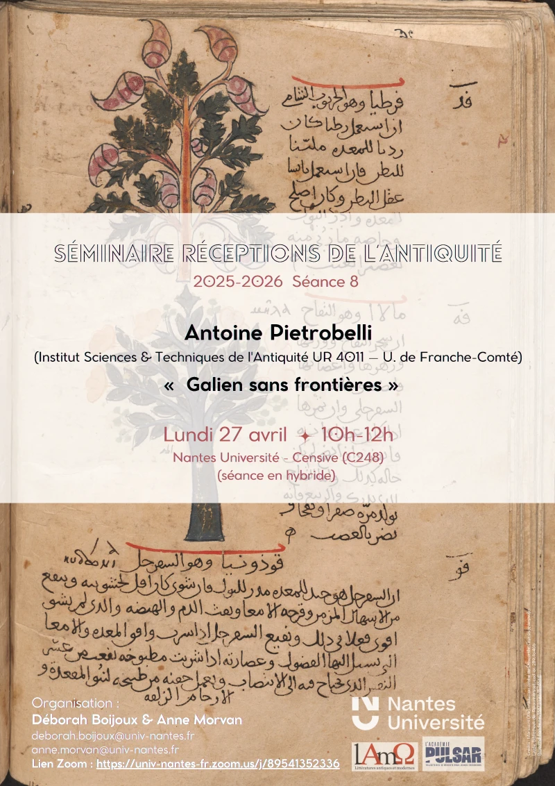 Ce séminaire est destiné aux étudiants du Master Arts, Lettres, Civilisations – Parcours Sciences de l’Antiquité ainsi qu’aux étudiants de Master inscrits au cours “Réceptions de l’Antiquité” mais toute personne intéressée est la bienvenue.